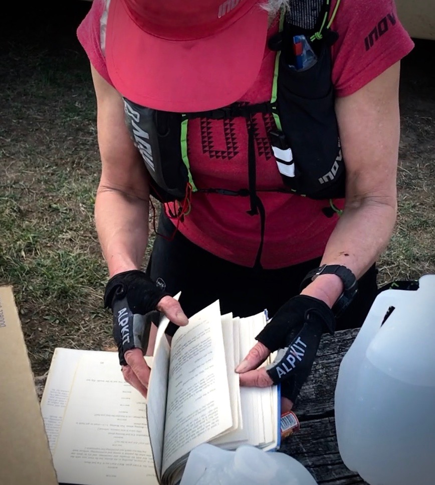 It was very warm in the campsite - about 60F so about 15C so I went with a Dri Release Tee and my favourite Enso sport skirt. I packed a long sleeved thermal teeshirt and the Protec shell waterproof. I had loads of food - the usual Tunnock bars, Brunch bars, sweets and then noodles and gels. It was hard to know how much I was going to eat over about 24 miles and 4800m climb. And then we were all lined up at the Yellow Gate and the cigarette was lit. We were off !! Jon had said most people walk to start with but everyone was running, and running fast! It felt so wrong to be running uphill at the beginning of an Ultra but I remembered the pace at the start of the Ultra Tour of Monta Rosa and just thought I'd have to go with it for a bit. I very soon felt I was at the back of the field and Billy was right behind me. But I needed to slow down. A few ladies had passed me and spoke to me - Maggie Guteral and Stephanie Case that had done it last year. I tried to keep them in my sights. Approaching the end of the first climb I looked up and saw Pavel going left, I reached the spot and everyone else was going right - so I went right. We crashed through the trees and undergrowth and all of a sudden we were there - at the first book. To me it looked like anywhere in the middle of the forest. But I took my page in turn and got my compass out. Steph said "Oh we went right here a bit" and took off. The pace was so fast that I thought I'd stick with her and use my compass as well. Down this hillside covered in trees, fallen trees and rocks we went. The Graphene shoes were amazing and I then found the descending pace nice and comfortable as everyone else was sliding around in their trail shoes. Another man seemed to know exactly where he was going and without a map or compass just headed down and across streams. We were heading in roughly the direction I would have gone. Billy was still around but the rest of the field were now either miles in front or behind. It was much warmer than I had imagined and I was drinking a lot. From now on Billy and I stuck to Stephanie and the other man - Michael. We climbed up to Book 2 and then Michael stopped for food on the descent. I turned round to see him heading back up the hill - then he turned down again and caught us back up. "I've left my poles" he said. "But I will manage without them". He soon broke some sticks up though as the climbs were too steep and the descents too slippery not to have poles. When the descents were very rough we grabbed trees to stop us tumbling down - I was glad of my Alpkit gloves. The gaiters too were a godsend. The briars were at low level mainly and would have been shredding my legs otherwise. I was way too hot and had drunk all my litre of water but we passed many streams and me and Billy filled up constantly. I was worried about the fast pace but I think it felt fast because of the heat so I ate as much as I could to keep my energy levels up. I learnt afterwards the temperature was 70F/20C and humid.