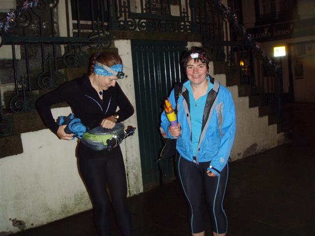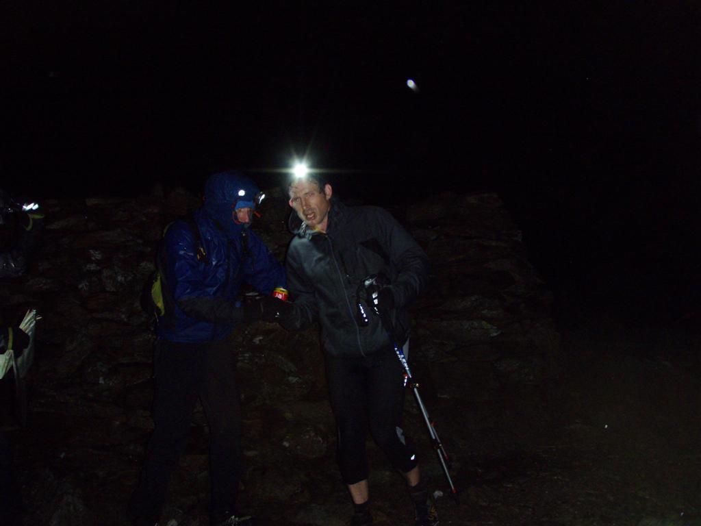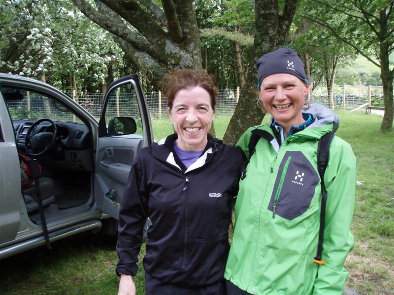 Leg 1 - Ruth Batty and Debbie Smith. The girls set off from the Moot Hall at 2am. It was quite warm but there was a strong wind and the clag was at about 200m. It also rained most of their leg. As the weather was poor it was also dark for longer and they had difficulty navigating in it. We waited nervously at Threlkeld at 5.35am the eta on the 20 hour schedule that I had produced. The girls arrived at 6.09am so were down on the schedule but actually completed the leg at BG pace (in 4.09 hours) which was astounding given the conditions.