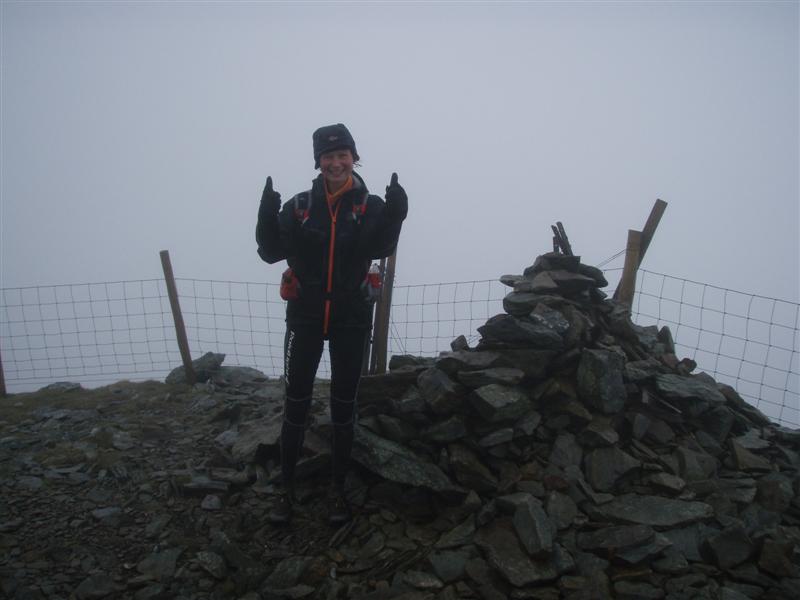 Leg 3 - Nicky Spinks and Pippa Wilkie. Setting off up Steel Fell my legs felt good and I was pleased to knock a few minutes off. The schedule had seemed relatively easy for this leg but I was reluctant to cut it much shorter so had scheduled 5hrs 20 in total. Knowing that it would be hard to make up time once on the rocks we pushed hard across to Rosset Pike and were rewarded by getting back on the 20 hour scheduled time there. We were also lucky with the weather; after a few rain/hail showers the clag cleared across the Langdales which made navigating much easier. It looked thick above us on Bowfell though and it was !!! We were then in clag all the way with the wind picking up across from Great End and making any running across the rocks impossible. The rocks however were drying in the wind so there was some bonus. Scafell Pike was very busy and there were even a couple of casualties but they looked compus mentus so I left them alone. Dropping to Mickledore we had decided on West Wall Traverse over Broad Stand and I was pleased to see Carl there. He reassured Pippa along Lord's rake and up the traverse much better than I would have done. Touching the top of Scafell we had lost a few minutes and so hammered it all the way down out of the clag to Wasdale finishing at 3.10pm - now only 10 minutes down on the 20 hr schedule. We also broke the current leg record by about an hour finishing in a time of 4.56 hours