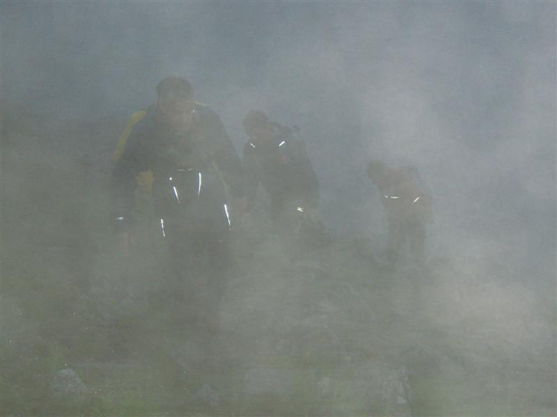Over to Bowfell and then across to Scafell we went. The clag came back down and stayed down. It was very slow going and I started to worry about the schedule, the time we were losing and Lord's Rake. Off Broad Crag at 6am we heard voices and met coach loads of "Three Peak'ers" having "done Ben Nevis and now on their way to Snowdon; it seemed like unorganised chaos. We slipped and slithered round them and headed up Scafell Pike.