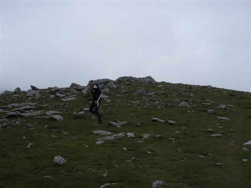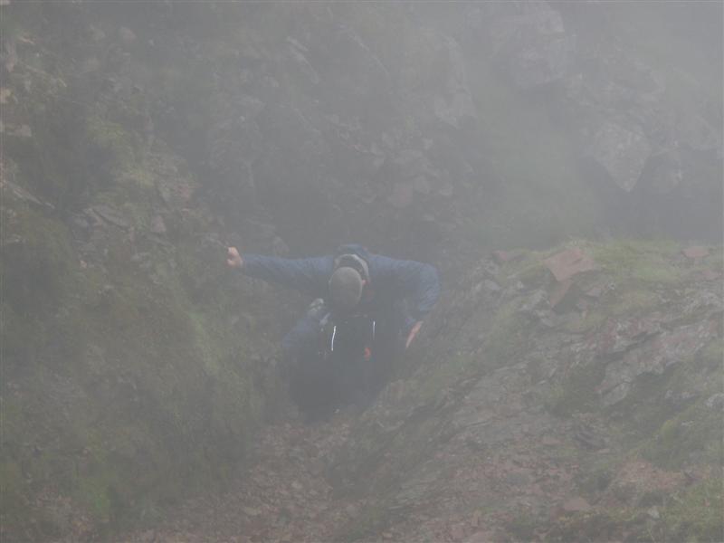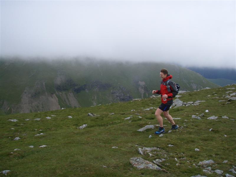 Keith set off up Yewbarrow with a new Totley lad (Alex) and Simon Rippon. Tim and I had changed clothes and felt much happier. Keith was in a good spirits and chatted away. The rain had stopped across Scafell and so we were all dry and hopeful it had passed. We made time up across to Steeple which was encouraging. The wind however picked up there and was bitterly cold. The rain came down and it was rather miserable. Extra layers, full waterproofs and new gloves went on and off down the rocks we slithered (yet again). We tried to make up a few minutes across Pillar, Kirkfell and Gable but to no avail. Every time we gained a couple we would lose them. The rocks were so slippy and Keith was tired. The rain had washed normally nice paths away and made a gully through them. Navigation was still hard and we made silly errors across to Brandreth and Grey Knotts. Leaving Grey Knotts I got the situation sorted in my head and tried to relay this to Keith clearly. He certainly understood as he said straight away "So it's still do able then? I thought it was all over and you lot were just carrying on being nice to me? Right I'm not stopping at Honister" and he flew off.