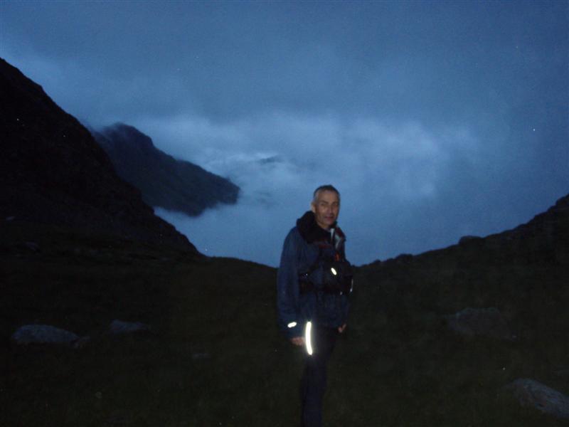 16th Sept - Yesterday I did what I enjoy doing most. I spent 10 hours in the Lakes supporting on the BG in initially in glorious weather which turned a little windy and claggy. Joe Mann and Pete had set off at midnight on a 22.50 schedule. Tim Whittaker and I had travelled up in the morning and met with Teresa and Nick Whittingham (Penistone Footpath Runners) on road support. We set off at 8am from Dunmail with Joe and Pete along with their "student friends" - Pete (2), Bob and Tosh who were amazingly bouncy and entertaining! Joe and Pete made good progress on their schedule and once in the clag they kept positive and both were eating well. By the time we dropped into Wasdale we had lost Tosh twice (??) while Pete (2)and Bob had stopped to help some climbers up Broad Crag so there was just me and Tim to carry on to Leg 4. For support in Wasdale we were met by Bernice Nixon and Helen (a whooping student friend). The only flaw in our plan to carry on was lack of food but Joe had loads and Bernice had cooked up a wonderful corn beef hash which we all soon demolished, followed by tea and cake (very civilised!).
