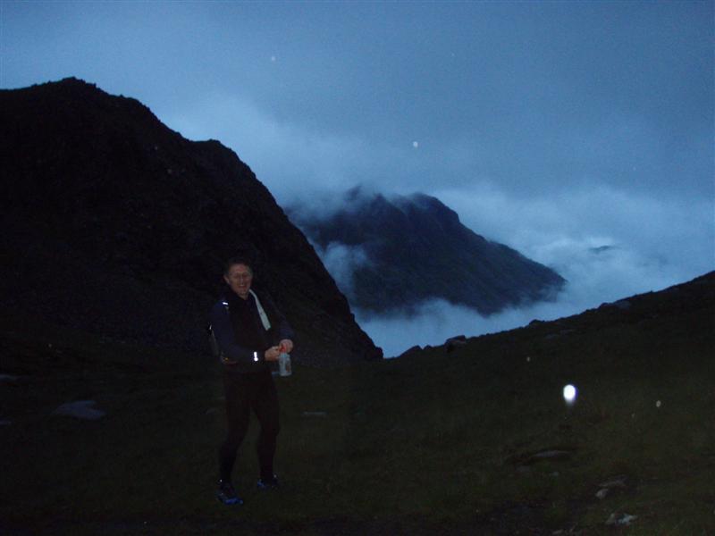 At 600m I heard voices and saw torches behind. It was them! Willy, Bob Berzins and Steve Martin. Willy was very steady and complaining of cramp. He seemed pleased to see me - I certainly was to see him. We continued down to the col and on up to Moel Cynghorion. I offered him a couple of "spicy squirms" - squirms being one of his requests - and these went down well. He was still climbing very well and I was confident that it would still be ok. However we still lost more minutes over Foel Goch and Foel Gron even though Willy was now moving very well. I was just hoping there was enough in the tank to get him down to Llanberis at a good pace.