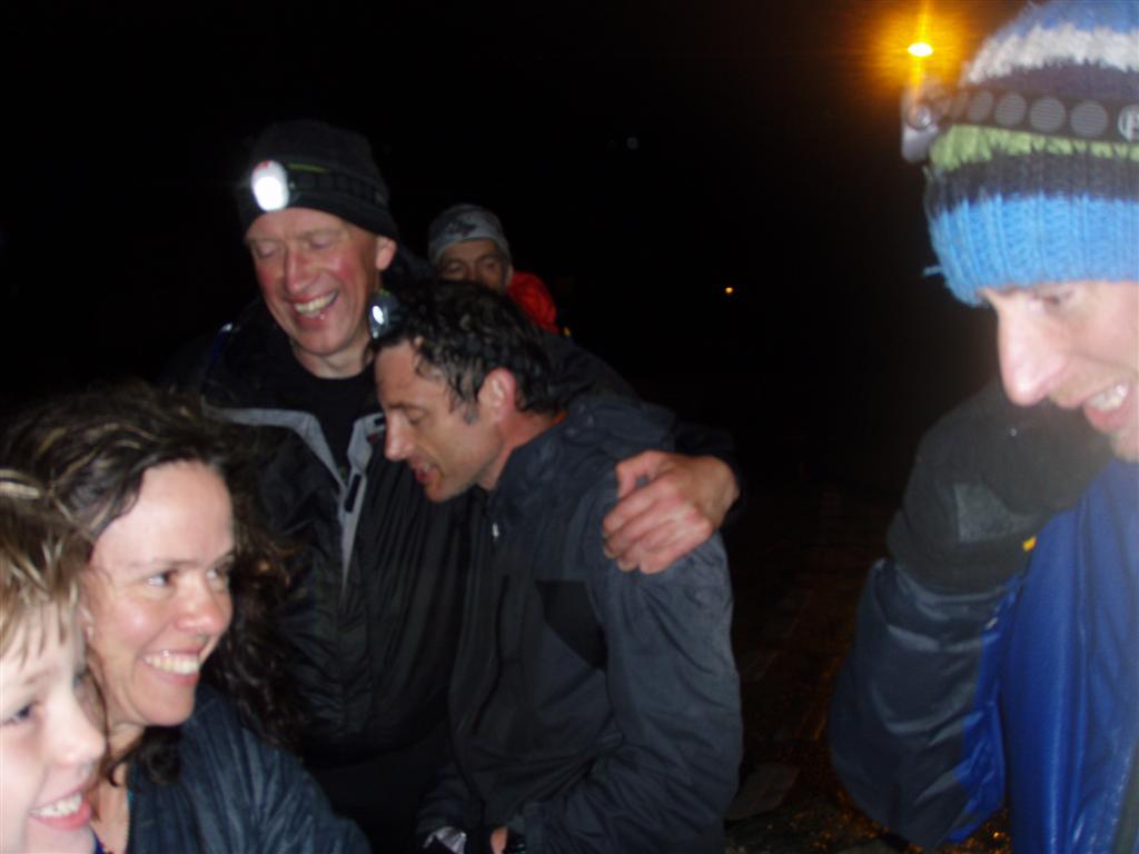 Meeting Ian Fitz and Carl Betts on Moel Eilio cheered Willy up further and I managed to get one photo even though the camera was complaining of being wet and cold - who wasn't! Off we went down to the lights of Llanberis. Through the heather, gorse and bogs on the direct line to the gate. There I jumped in my van left at the fell gates and sped down to Llanberis to be there when Willy and co trotted in under 24 hours (exact time to discovered as I didn't have my watch running). Well done Willy.....