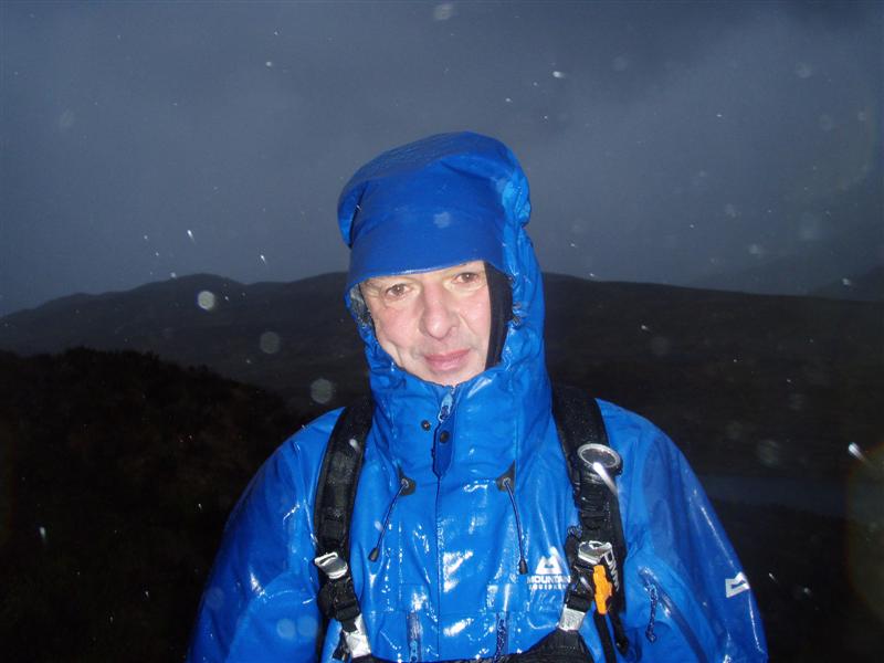 The ascent of Pen yr Ole Wen was ok but we could see the weather approaching and by the summit it was raining/hailing/sleet with a strong wind. Even though we were prepared for the weather it was incredible how quickly it came in and we were soon wearing many layers and navigating in clag just wanting it to be over and to be in a nice warm cafe! I was very careful making sure we got the right ridges as a "wrong valley" descent could be disastrous!!! Battling across the ridges we only saw one pair of walkers battling the other way. Tim R asked "when can we bail?" and I said "after the next hill" (Pen Yr Helgi Du) but as we descended Carnedd Llewelyn from 1064m down to 800m the weather and snow improved considerably so I didn't let on that we could now "bail" and continued onto Pen Llithrig y Wrach where I said to Tim "we can bail now" and ran off on the normal Paddy Buckley descent to Capel !!