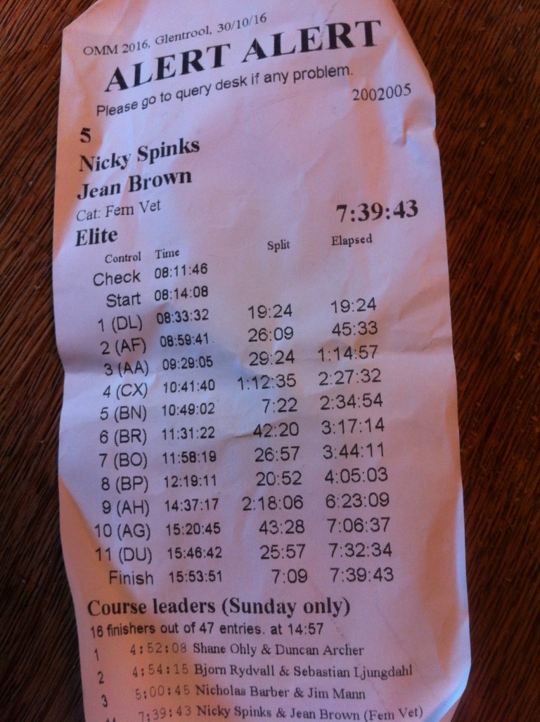 1st November - Just a quick update as very busy on the farm, with Trigger, with talks and courses and coaching. So will update with a proper OMM report asap. Basically it was a long hard course - Day 1 it rained softly a lot and was claggy so me and Jean concentrated a lot on navigation. Overnight it was warm and I slept very well. Day 2 was warm, dry and we got some nice views when we dropped under the clag. We ran a lot with Jon Whilock and Bryan Carr and made good decisions. It was nice to stay in front of the cutoffs and finish. We were shocked that our slip said "Alert" and panicked but it was just a kit check. My toe was painful as it was poking out the sock most of the day but it's forgiven me now! We finished in 16th place, 2nd Ladies behind some very talented Scottish ladies who were 7th overall! The OMM Results 2016