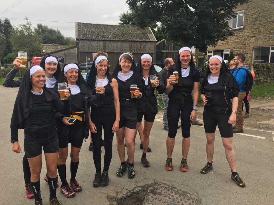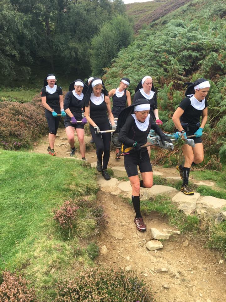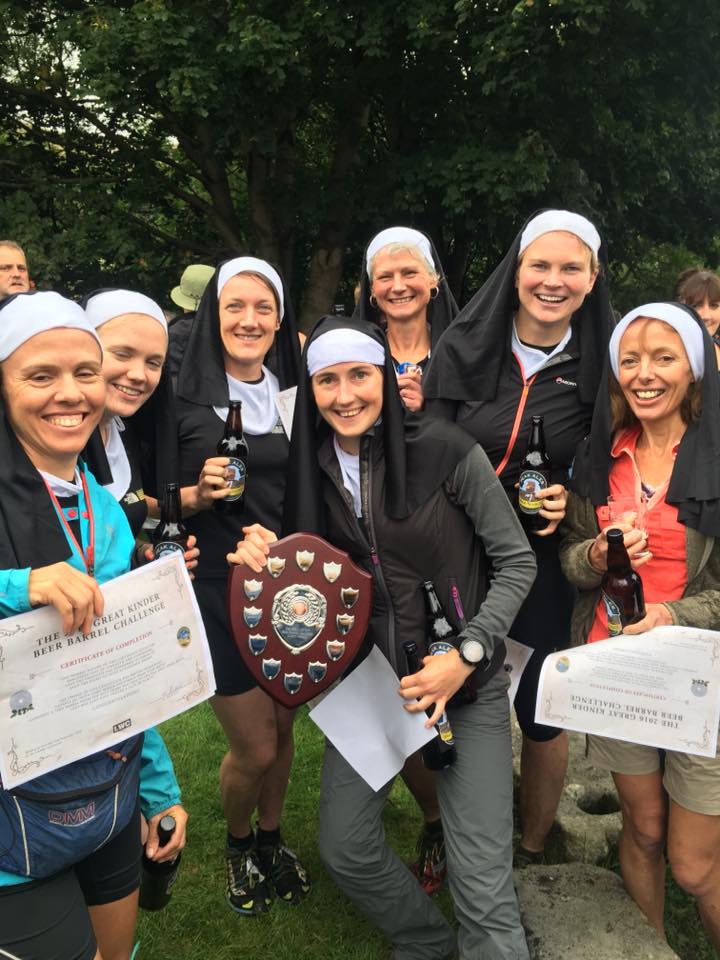 12th September - Yesterday eight Dark Peak Ladies hauled a barrel of water (75kg) from the Snake Inn to the Nags Head in Edale dressed as nuns! It was at times very hard work but overall a fantastic day and one that we plan to repeat! With staggered starts we were 3rd off and finished 1st - so without any of the faster teams catching us although when the times were recorded we were actually 9th out of 14 teams and 1st Ladies team! The Results should appear in due course on Kinder Beer Barrel Race but for now here are a couple of photos and a Video even!!
