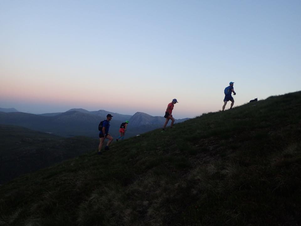 30th May - The good weather has continued and I headed up to Scotland again to support Jim Paxman on his Ramsay attempt with Wisp and a band of merry supporters. The weather was very good, quite warm but with a strong easterly wind. The wind didn't help at times as on the rocky ridges it was quite hard to run. Jim set off at 7pm and we stayed above and on schedule until it fell dark. Then the combination of dark and wind meant we fell behind but Jim was happy as he knew he might lose time in the dark. Arriving at Loch Elide Mor just 30 minutes down Jim ran straight through.
