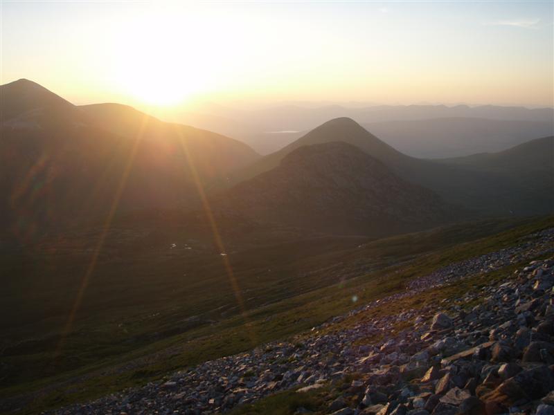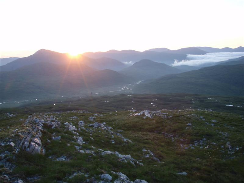 I decided to go on with Paul up Sgurr Elide Mor (mainly because I wanted to recce it!) and we set off. The ascent was long and tiring for Paul. We reached the ridge and I looked across at the Binneans trying to see Steve and Andy. I was sure they would have given up on us as we were now so far behind schedule. I couldn't see anyone but waved hopefully. Paul decided to call his attempt off at the summit; something both me and Lawrence were glad about. Another hot day in the Momores didn't seem appealing. Video taken from the summit of Sgurr Elide Mor at 5am