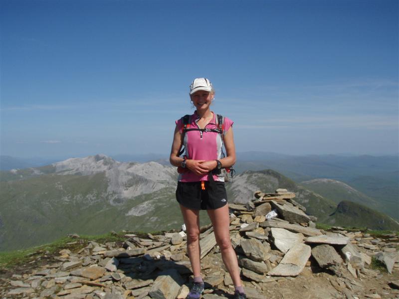 Saturday morning dawned as forecast. After a hearty breakfast I dropped Andy and Steve off at Kinlocheven to walk into the route. They were meeting us below Stob Ban on Leg 1 and then between Binnean Beag and Binnean Mor on Leg 3. I drove round to Fort William YHA and at 10.30am set off up the Ben. I was scheduled to be supporting Jim and Keith from the Grey Corries but wanted to do some leisurely reccying of my own first. Jim and Keith were scheduled to start at 12.30pm. It was very hot walking up and people were struggling to climb in the heat. There was also a distinct lack of water in the streams. I filled up at the waterfall stream and then took a direct line to the top. I have never seen it so busy - there must have been 100 plus people on the summit. I ran off down towards Carn Mor Dearg and then stopped for a picnic and chatted to local walkers (about Yorkshire beer!). By the time I reached the col before the Aonachs had drunk the 1.5 litres I had. At the stream there I filled up adding 2 litres into my bladder and staggered off up the climb. I missed Aonach Mor out and sat on Aonach Beag watching for runners down off Carn Mor Dearg. I was getting worried as by now they were scheduled to be on Aonach Mor yet I hadn't seen anybody. Some walkers came up, we chatted and took photos of each other. I decided to walk down and make sure Ian Winterburn was still in place on the Grey Corries as I maybe I had missed them somehow. He was and so we sat together anxiously looking up. Runners appeared and it was them. Now about 35 minutes down on schedule.
