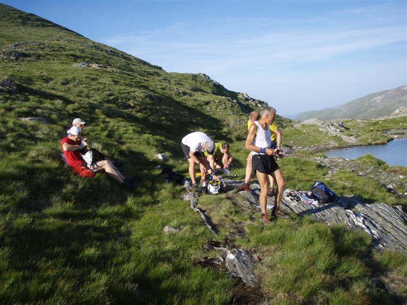 Keith arrived first looking strong followed by Jim who looked like he was suffering in the heat. The support (Simon Rippon, Tim Rippon and Glen Borril) were out of water and grateful of the liquid that Ian had hauled up. We set off but Jim had to stop on the ascent to take on food and water. Off the top Jim set a good pace and we were hopeful that as sun dropped and it became cooler that he might recover. Crossing the Grey Corries it was still very hot and everyone seemed to be struggling in the heat. Water was also a problem; Tim and Simon dropped to fill up before Stob Coire an Laoigh. Across to Stob Coire Claurigh Jim was running well but climbing was still a struggle for him. We didn't get a good line off and were caught by Paul Reeve who was also attempting but had set off at 1pm. Everybody was glad of the lochan for water and to cool down in.