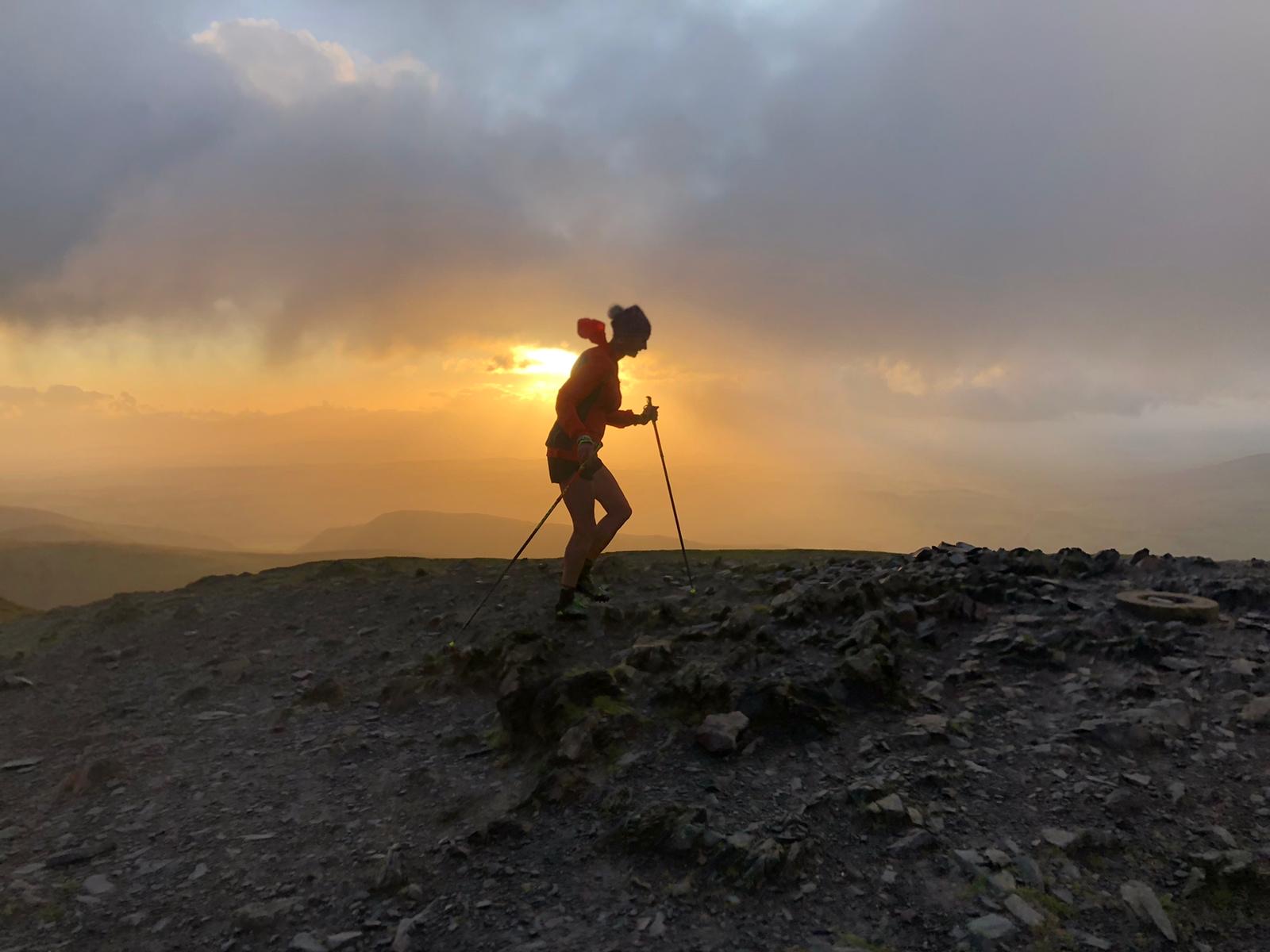 Amanda Heading drove me, Jasmin and Damian to the bench at Braithwaite at 2.45am and we waited in the drizzle for 3am. I felt well prepared this time and it was good to have such good runners and friends to set off with. They both had maps which was pleasing and I knew Jasmin could navigate exceptionally well. Damian isn't renowned for navigation but has done a few solo rounds so is very competent. We set off along the road and I remembered it from last time. No photographer this time. I liked the low key start and hoped that I could find my way through the bracken and heather to the main track. The bracken was so high and crossed the path making it hard to push through which worried me but I couldn't think of anymore bracken sections on route apart from the very last descent which I had clipped twice!! I found the route up and climbed well. I had pinched minutes off this split for the later splits and we it the schedule spot on. Heading up to Skiddaw we hiked into some really crap weather. A headwind and thick clag making it very hard to figure out where the edges of the path were. I stayed on the right following the path stones next to the grass. Confusing even though I had been there many times. I was looking for the col where we needed to drop left on our return and couldn't spot it. Over to the trig we battled - but on schedule which was pleasing. Turnaround and back over one bump. "It must be here we drop" I said. Jasmin had a bearing and I tried to find the grass I knew was there somewhere. We dropped and contoured then hit the fence. Climbing it I couldn't tell where we were but then there was a track, turning left on the track I was partly ok with it. Then the track bent right and yes it was the right one. Jasmin caught up and we dropped below the clag. There was Sale How below. I ran down and up to the summit. We looked across and now the sun was rising and we could see the top of Great Calva, clear and not in clag which was pleasing. We dropped to the main track and I asked for more food. After supporting Helen Elmore I had been impressed at her eating and decided to be more like her. I was eating a lot and happy with everything. I knew it was early yet though. Up Calva we walked/jogged and to the summit. I looked left and muttered "Not this time" to Knott and Bowscale before heading back and down the horrid path directly to Blencathra. I was on schedule and feeling positive. Jasmin and Damian were great company and always had what I needed while I listened to them talking about their races and plans. The sunrise as we climbed Blencathra was incredible and Jasmin exclaimed that everytime she ran with me we got a great sunrise. Down the parachute drop we went and arrived at Threlkeld on schedule. I had my two allocated minutes and off I went to Clough Head.