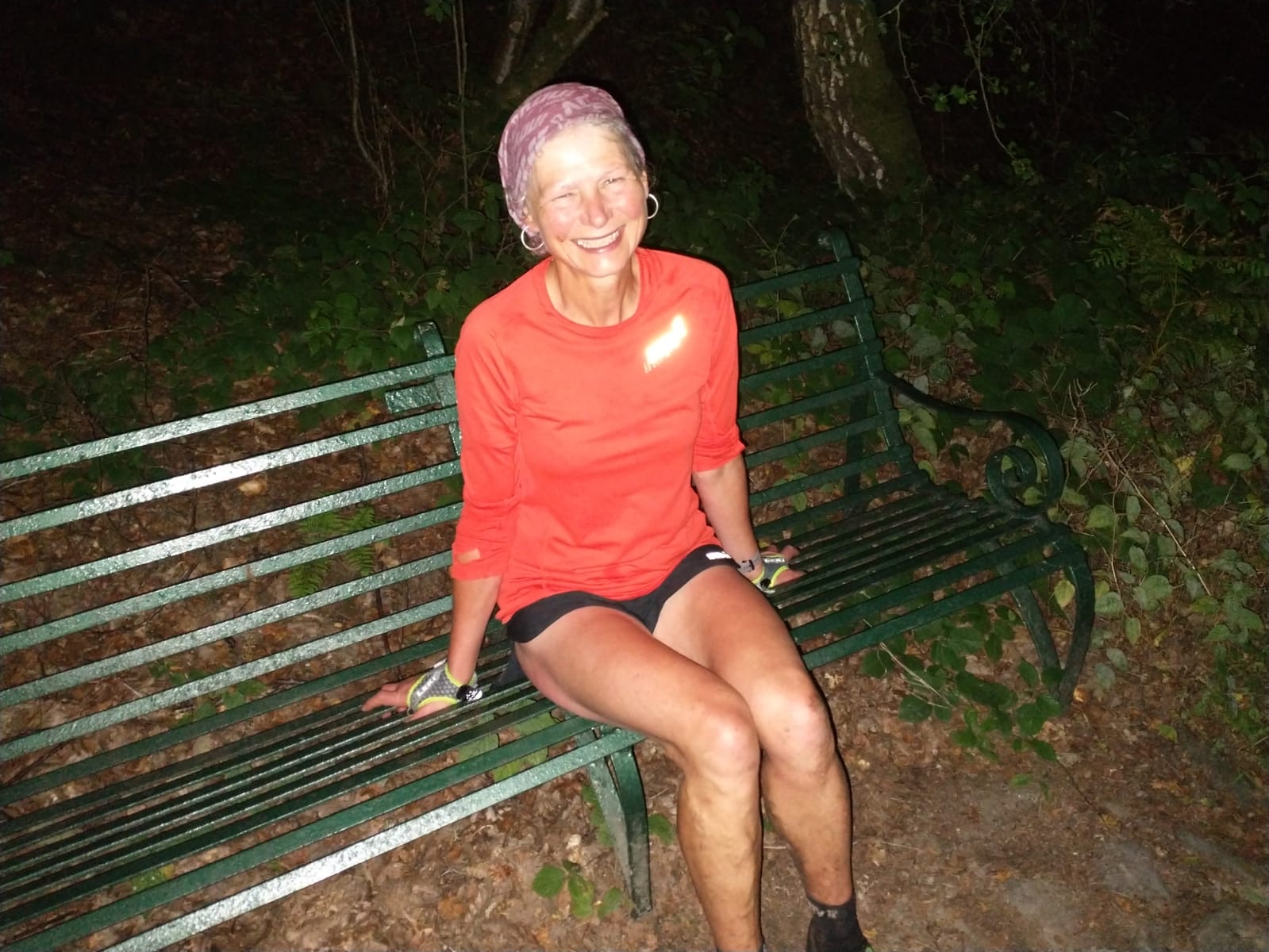 I had already decided not to stop at Newlands so when Kirsty pointed me to a car I just said "I'm not stopping" and carried on walking. That threw the support into a panic though as Amanda was stuck in traffic and wasn't actually there. So the new support plan had been to take the rest of the Leg 5 food onto Leg 6. But me carrying on gave them no time to sort it all out and so no rice puddings, no sweets and only a few of my gels made it over. In hindsight I should have waited and helped but in the moment, and not really taking it in that Amanda wasn't there, I just kept going past a group of party goers that apparently had been chatting to Adam and Helen. They shouted for us to join them and I said "I can't party yet!!" Heading up another nice climb I felt so much better with chatty and positive support again. Adam was out in front and Helen was by my side. Kirsty put in a stirling effort to catch me and along to the col we trotted where we met Flora Balaster with Tryfan, their dog. and exchanged some hugs and greetings. But no more food. I had kept the head torch on from Leg 5 as there my replacements were with Amanda. Kirsty, Helen and Adam had brought all their spares and I seemed to be able to use batteries like smarties and we had to change head torchs about three times on the leg. I think the problem was compounded by some drizzle and slippy rocks. I was worried about tripping and wanted strong light. After I had eaten the 4 gels of my own there was very little else to go at. A few Hula Hoops and then after an attempt to eat and keep down a gel of Kirsty's which it my stomach like a block of lead, and it tasted like lead too. I ran along feeling decidedly sick. My pace was now slower than not having no energy and so I threw the gel up and decided to not try eating anything more now and to just manage my energy levels as feeling sick was slowing me down more than lack of food was. We ticked off the tops one by one with me puffing away like a train up each one. The legs still felt good but the energy was lacking somewhat. However we were still on for a record breaking time although I know we all did a lot of watch checking. I had known these splits were pretty fast from my reccies but it was a bit scary losing time so badly on each split. It was only on the last top Grisedale that I realised it should, bar a bad fall, happen! It was now claggy and raining so the rocks were lethal but I was happy descending as fast as I could. Heading down the steep bracken fested path I was glad that my bracken cutting efforts had come to fruition and I was able to slither down a pth instead of be bracken bound in head high undergrowth. It was a lovely feeling to hit the track and be running down to finish with Helen Elmore by my side. Down the knarly path avoiding more cut back gorse and brambles to the bench where I gratefully sat down and grinned in happiness.