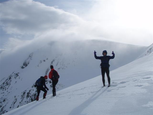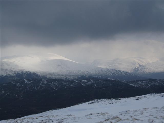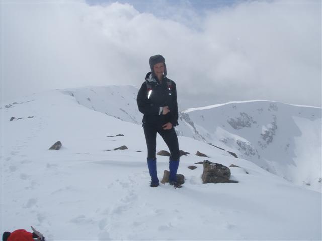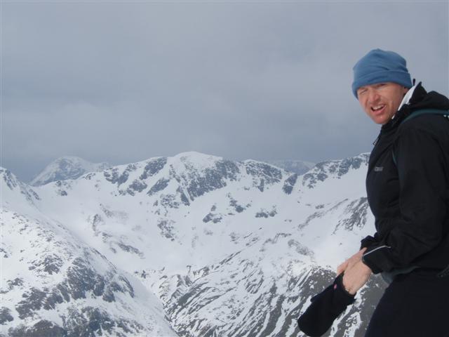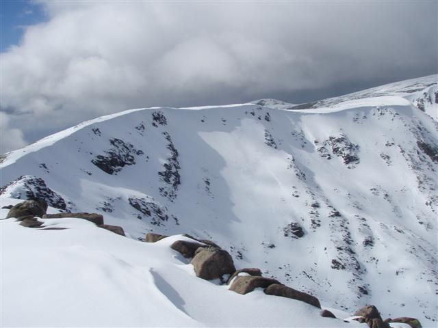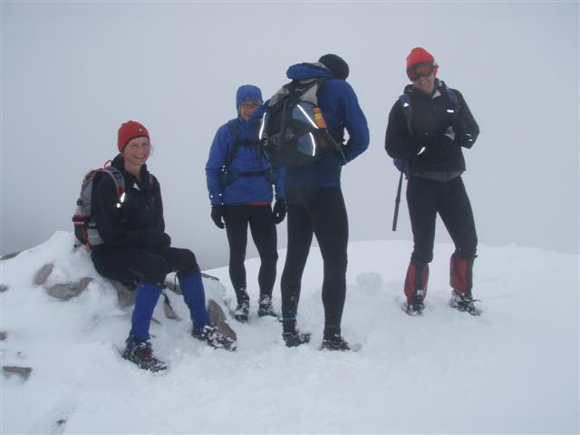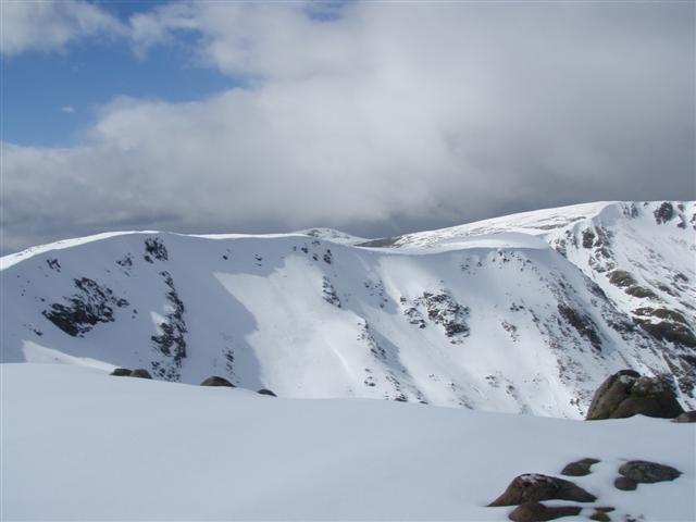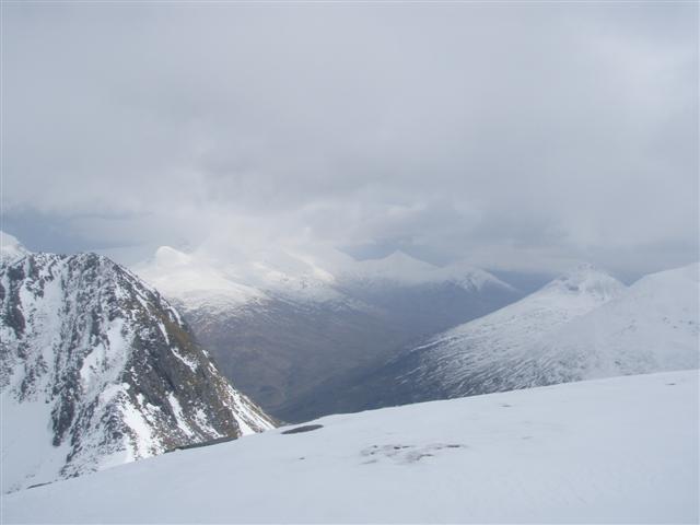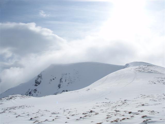 On Stob Ban the weather came in and we had a series of snow showers and no view from the top! Along the edge towards Mullach Nan Coirean though the sun once again broke through.