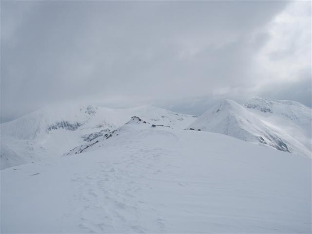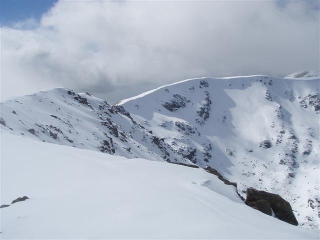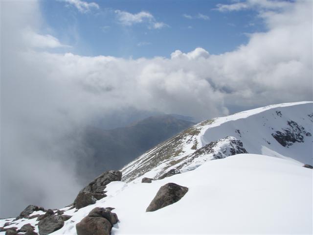 The going was very slow with soft slushy snow. Ian, John and Roy decided to head back while Ian and I continued on. Once on the ridge it was nice and the clouds were nice and high giving us very good views.