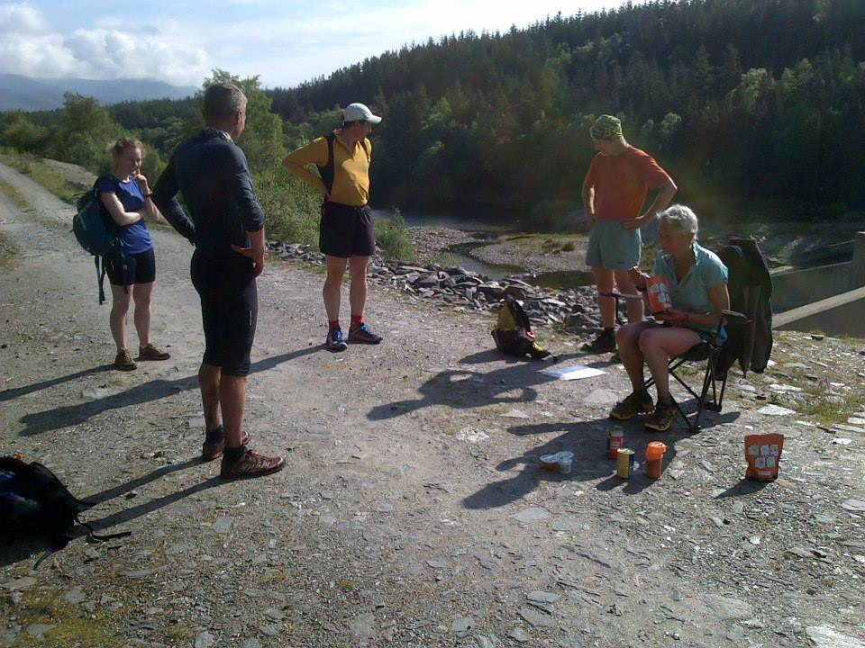 Mary Gillie and Jon Gay were ready and off we went. I said "I'm having trouble with my stomach and need to keep this food down so please no questions till the top". They nodded and it was nice to feel that they understood. We climbed in relative silence with Jon making some navigation suggestions and Mary offering me water. At the top I was encouraged that I was up on schedule. I followed Jon and we discussed the way off. I decided to bin my original route and go with the usual walkers path; the one Yiannis was surprised I wasn't doing when we had reccied it. It wasn't too bad and led us to the stream. I was so conscious that I could not let time slip so I jogged what I could across to the Binneins. Meeting Ian Fitz, Jude Stansfield and Simon Rippon it was a shame I felt so rough. A stop would have been nice but no time and nothing wanted so I carried on. I tried a smile as they looked worried. I should have said thanks to Jude for coming in there but I wasn't even courteous to her at the time. Setting off up Binnein Beag it was now a job to be done. We reached the top; up again on schedule. That cheered me no end and I managed a proper smile to Simon Rippon while descending. Lots of memories of my 2008 round came back. I had found Binnein Mor hard. This time it seemed to drag on but it was ok and the route we took was great as it popped us out at the top which was a fantastic surprise. Up again. "Hey ho!" I thought. Looking at the spread Ian had laid out I couldn't decide between banana and sweets. I took sweets but only managed two. Gels were good though and so was water.
