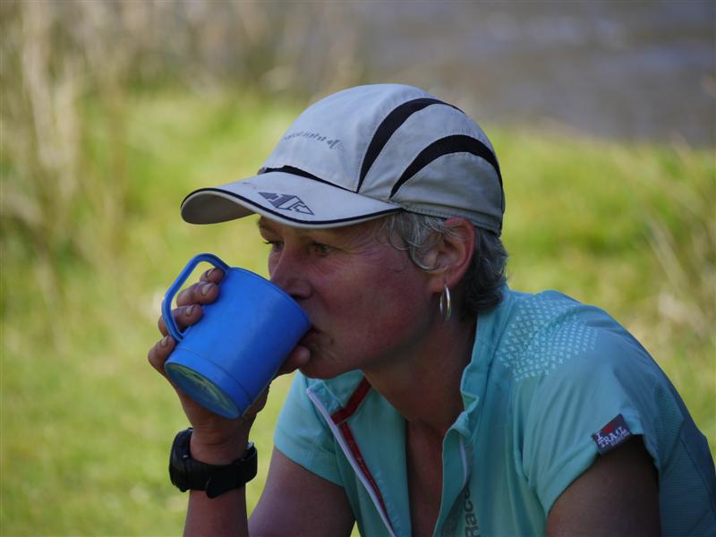Reaching the bridge Ian Charlesworth handed me a packet; it was chocolate mousse and it looked like I had just sicked it up. They hadn't made the Custard and Berries up. I was really disappointed. I took some tea and carried on with Tim Rippon. "What else could I do?" I could have waited I suppose (and maybe should have; now with hindsight) but the legs keep going so I did too. "Ok what else is there?". I ate something else; I can't remember what and just carried on. The new support asked lots of questions, trying to find me something else to eat but hadn't made up any energy drink either. To be honest I thought "What have they been doing then all these hours waiting for me?" but it's not fair to complain; they are there only for me. I hate feeling like this; that it could all go wrong. The stomach was grumbling; I had let it go hungry before Fersit, overfed it; it had recovered and the legs had recovered and now it wasn't happy again. Oh well - lets just get on with the horrid valley then. The split is hard and the clock is ticking. I ran what I could, ate when I could but then opposite Staoineag Bothy, after eating a fruit salad, I was violently sick. "Are you alright Nicky" said Pete. "No", I thought but said nothing. Crossing the river was easy as the water was so low but we couldn't find any tracks to cut the corner on. It didn't matter the ground was dry. Hitting the track again Ian and Tim said they would run on. I ordered coffee and Custard and they left me. I needed to think; "Could I pull this round?" I backed off from Sarah and Pete wanting peace and quiet. Reaching the ruin I saw Charlie Ramsay leaping about all excited with his camera. That that made me smile. Of course I forget that I'm still up on schedule and that everyone thinks it's in the bag. Instead I remember my 2006 Paddy when I lost over an hour in the last 6 hours but managed to finish in a nail biting 23.55 hours.