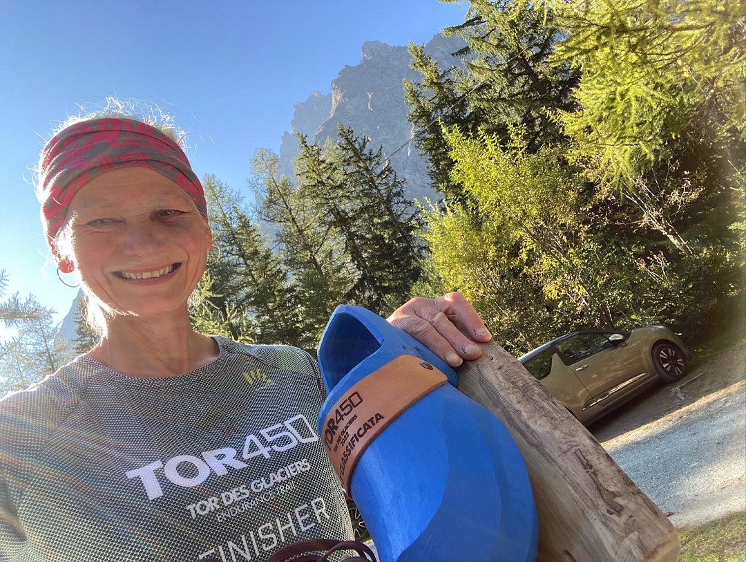 Kirsty, Mark and Flora were there at the finish and we had lots of photos taken. It was very moving to have my friends there to see me finish. The medics wanted me to be checked out but they were more concerned about my knee than my nose!! They put a bandage on my knee which soon came off on the walk back to the house we had rented! At prize giving I was awarded 3rd prize - a lovely wooden show to go with my wooden cow from 2021!