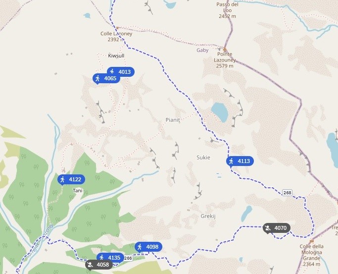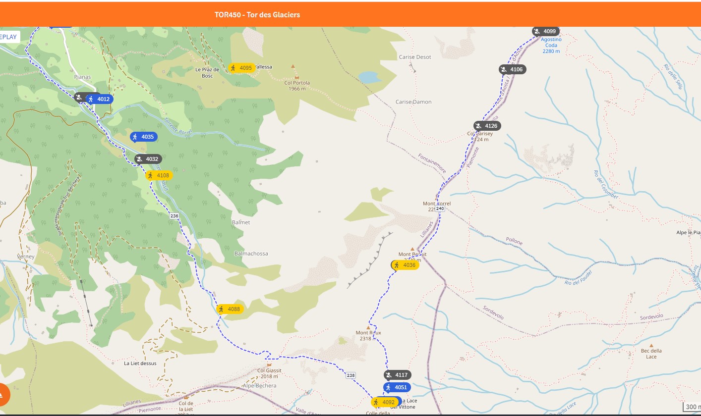 Again I have checked the https://owaka.live/tor450-2022 replay and 13 runners took the Tor des Geants route here and you can see three of them doing it on the right screenshot. The blue line is the Glaciers route. To me this many runners, saving two hours by taking short cuts shouldn't be allowed to go unchecked. I have emailed the organisors my findings but have had no response back.