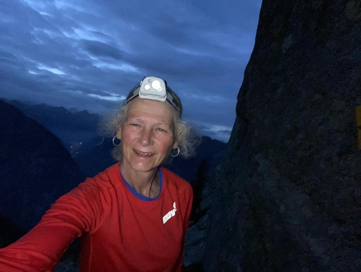 Sarah Hanzel (from the US) was just leaving the checkpoint and I asked her if she wanted company. She was very happy to wait for me to just get packed up and we left together. It was lovely to have someone to chat to as we walked along. Sarah said she was worried about this section as she had reccied it and there was a lot of via ferrata and also just bare rocks/scree to descend. It was dark when we started out but by the time we got to the tricky section it was light. This was the first time I had done Via Ferrata and I could see what she meant. There were Mountain guides on the hill and they helped us by showing us how to use the ropes and that made it easier but you had to trust the ropes and the technique of going forwards which meant you could see the huge steep drop in front of you! The guides were skipping about on all the loose rocks and were lovely to us. It took us ages to descend but Sarah said it was much worse without the ropes and we were doing ok.