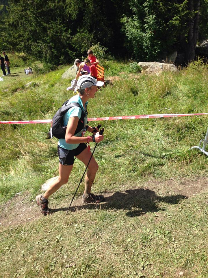 From Champex Lac to the finish there were three big hills, 2700m in total (two times up Ben Nevis) and 30 miles. I had hoped to do it in 9 hours. The first hill was very steep and I felt sick everytime I got out of breath. I stopped and ate crisps and then had a gel. I was strict with myself now as I wanted to finish this. Descending my thighs were solid and I used the poles a lot. I passed a Frenchman that I had been running with a lot; he pointed to his Achilles and said he wanted to see a doctor in Trient. He said for me to go on as he could walk down ok. At Trient I managed some bread dipped in soup, the Canadian arrived and asked me if I had Vaseline; I didn't but had a small pot of Sudocream as I was chaffing. I was reluctant to share but did so in the spirit of fellswomanship. Gecko asked me about the Frenchman and was upset he was pulling out. We set off together but he soon left me. I felt like I was going backwards. Running was almost impossible now; my thighs being solid lumps and painful. The second hill was not so bad; just very hot. Once again I ate crisps and had a gel. Descending I knew there was only one hill left - 900m of boulders apparently. I passed through the valley CP quickly as I couldn't eat anything and it was so airless inside. The climb was interminable - steep at first, then steep with boulders, then steep with steps, then steep with boulders and steps. Then it flattened off only to climb again over more boulders. It got dark and I lost the will to carry on. Stopping a lot to faff with my clothes as I was getting cold I just kept going. It was soul destroying to lose so many places but I was cheery to people passing me and congratulated them. "Oh well" I thought "It makes a change me being the struggling one; usually I get it right and run pass the battered and injured".