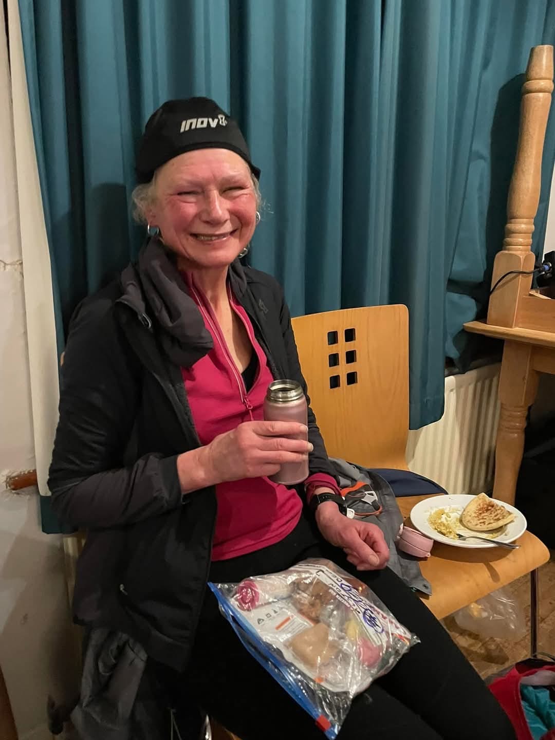 I had baked potato and something (beans?), followed by rice pudding and then banana and custard while we were doing kit check. I was trying to sort out my head torch and watch charging and planning the very long section to come. Joe was once again organised and we were less than an hour in the checkpoint. I was really enjoying being "on it". Eating was now good - I'd had a blip on Monday before Tan Hill and after that it was good. I'd reminded Joe to eat at some point and now he was constantly troughing out of his OMM chest pouch. His food looked better than mine most of the time but the Scottish tablet was going down well still. I changed my shoes here to the roomier Trailflys and wore them happily to the finish.
